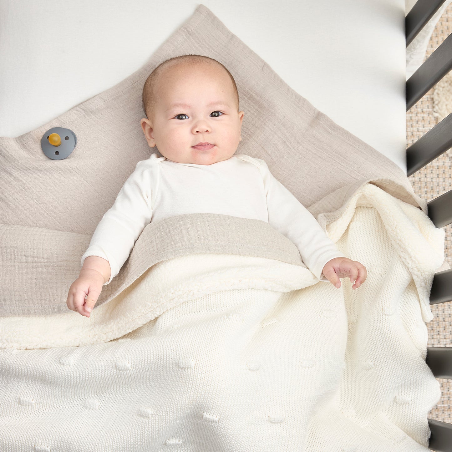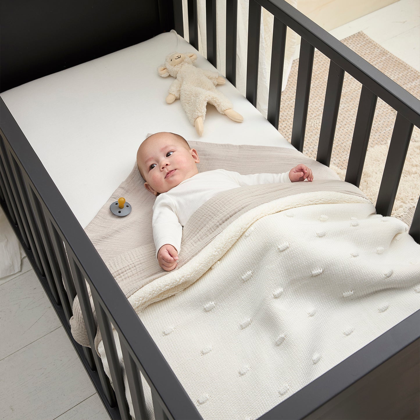 Mit dieser Meyco Babydecke Knots Teddy genießt Ihr Kleines besonders weichen und warmen Komfort. Die Decke besteht aus zwei Schichten, die Vorderseite ist aus 100% Baumwolle und die Teddy-Rückseite aus 100% Polyester. So hat Ihr Kind im Frühling, Herbst und Winter die richtige Temperatur im Bett. Verwenden Sie die Decke auf einem Meyco Baby Laken, um das Bett zu beziehen.