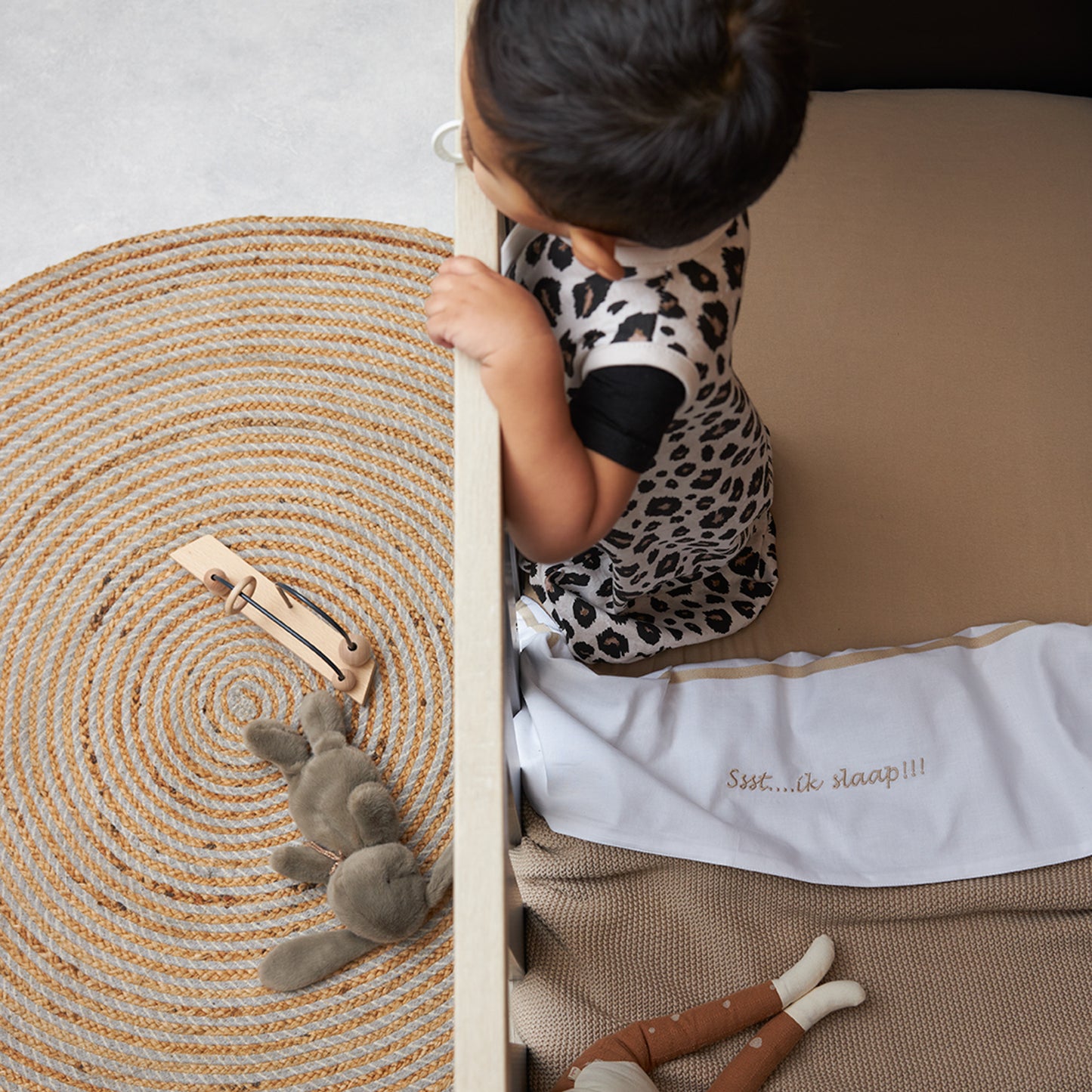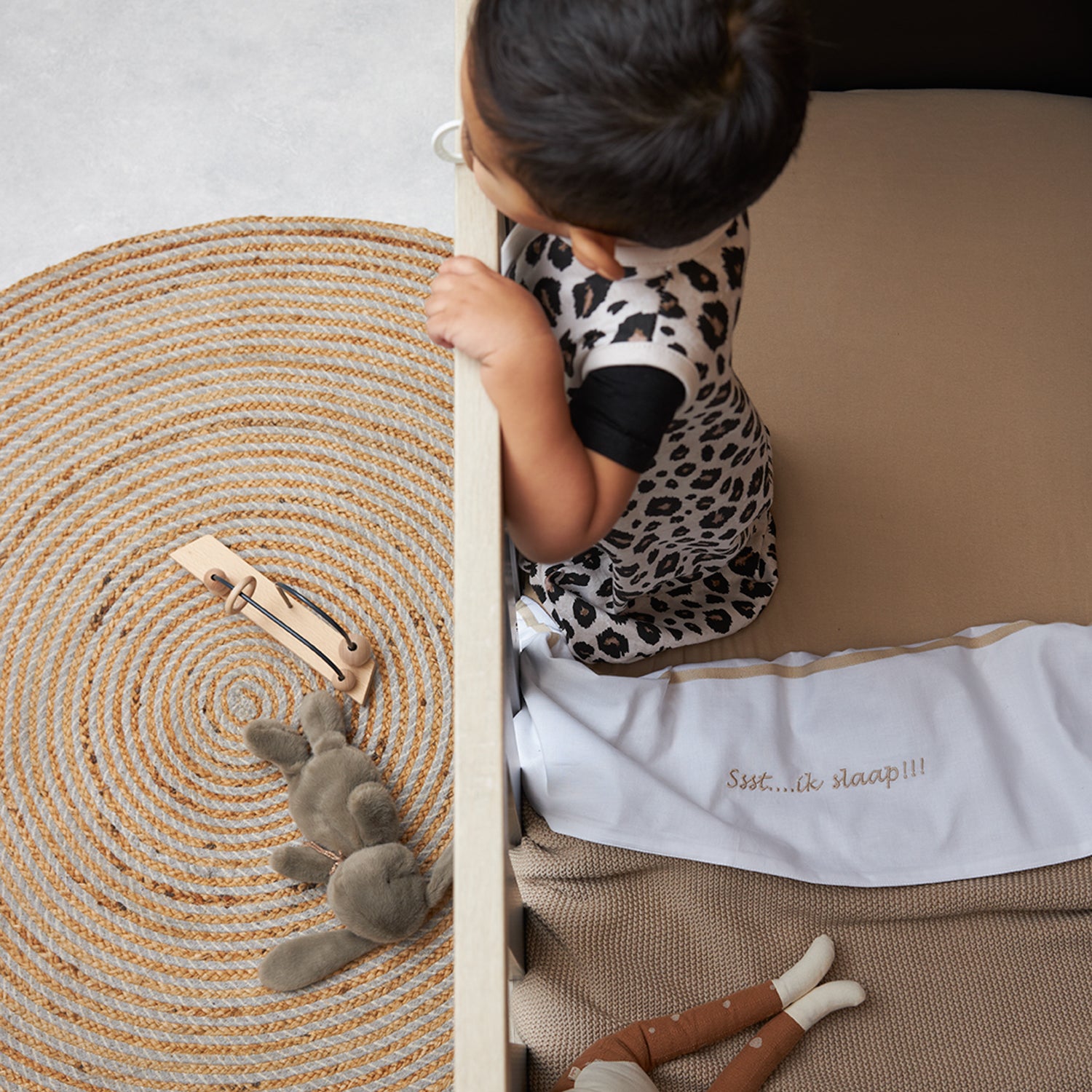 Das Bettlaken ist in verschiedenen Farben und zwei Größen erhältlich: ein 75 x 100 cm großes Laken für die Wiege und den Kinderwagen und ein 100 x 150 cm großes Laken für das Babybett. Verwende das Laken unter einer Decke. Auf diese Weise musst du die Decke nicht so oft waschen.