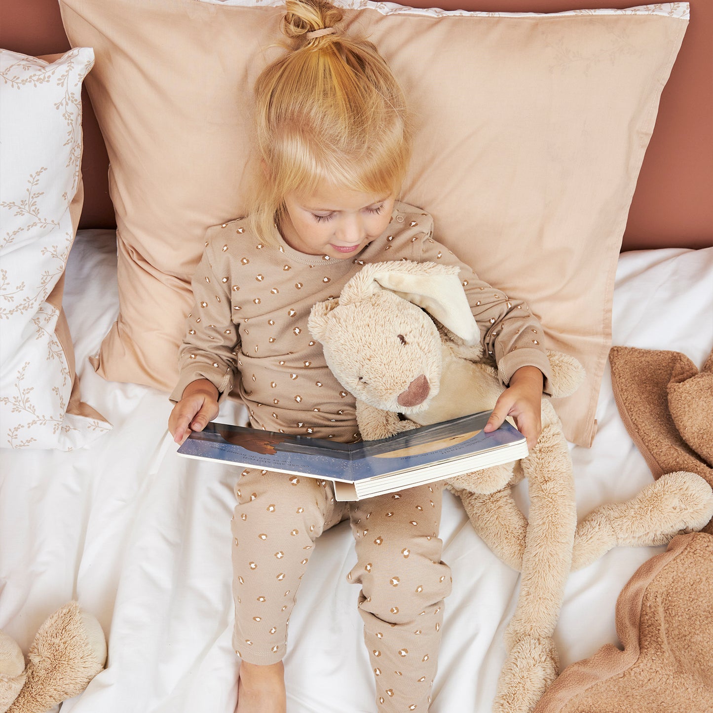 Der Pyjama besteht aus 100% Baumwolle. So genießt dein Kind einen wunderbar weichen und bequemen Schlafkomfort. Der Schlafanzug hat einen Rundhalsausschnitt, lange ärmel und eine Hose mit langen Beinen und einem elastischen Bund.