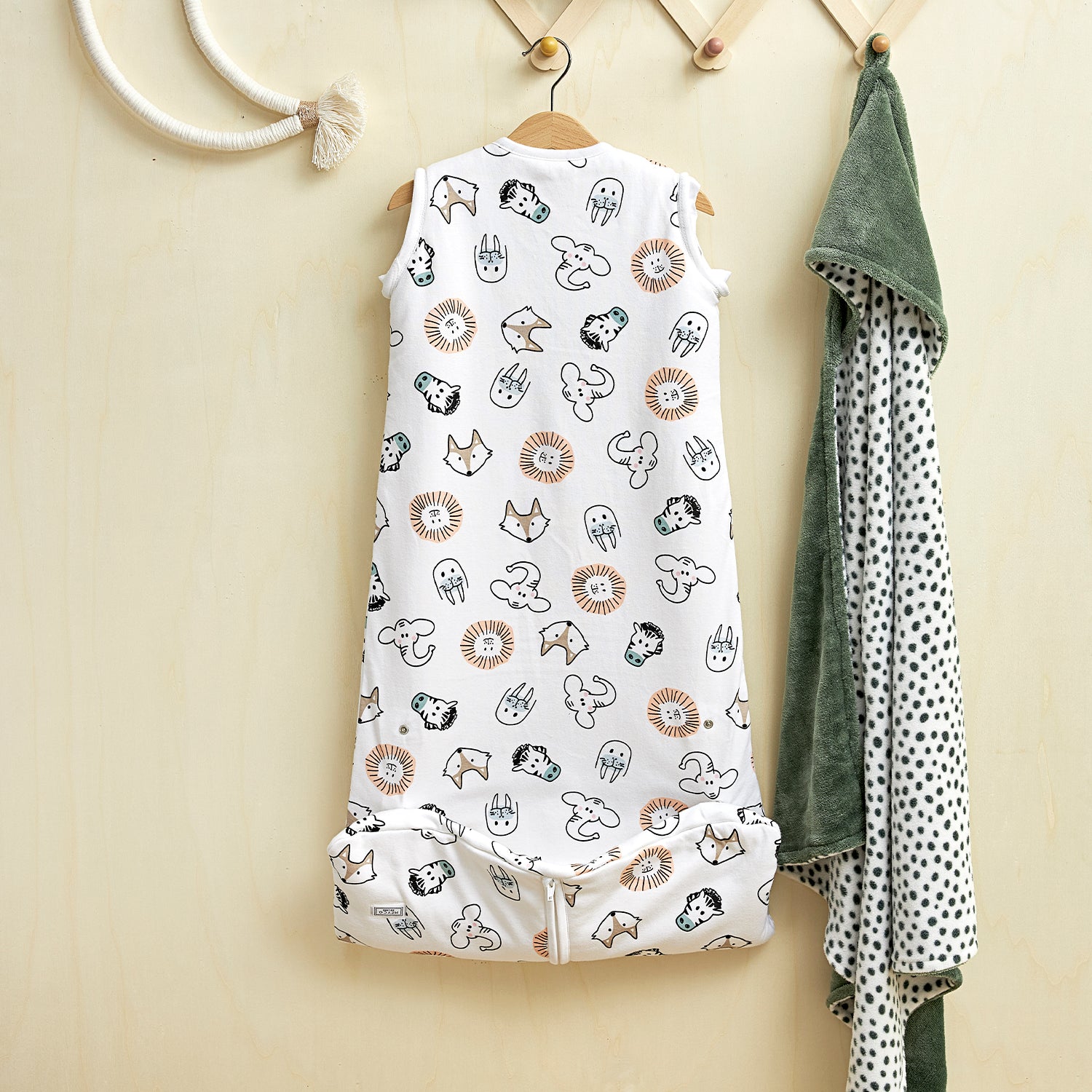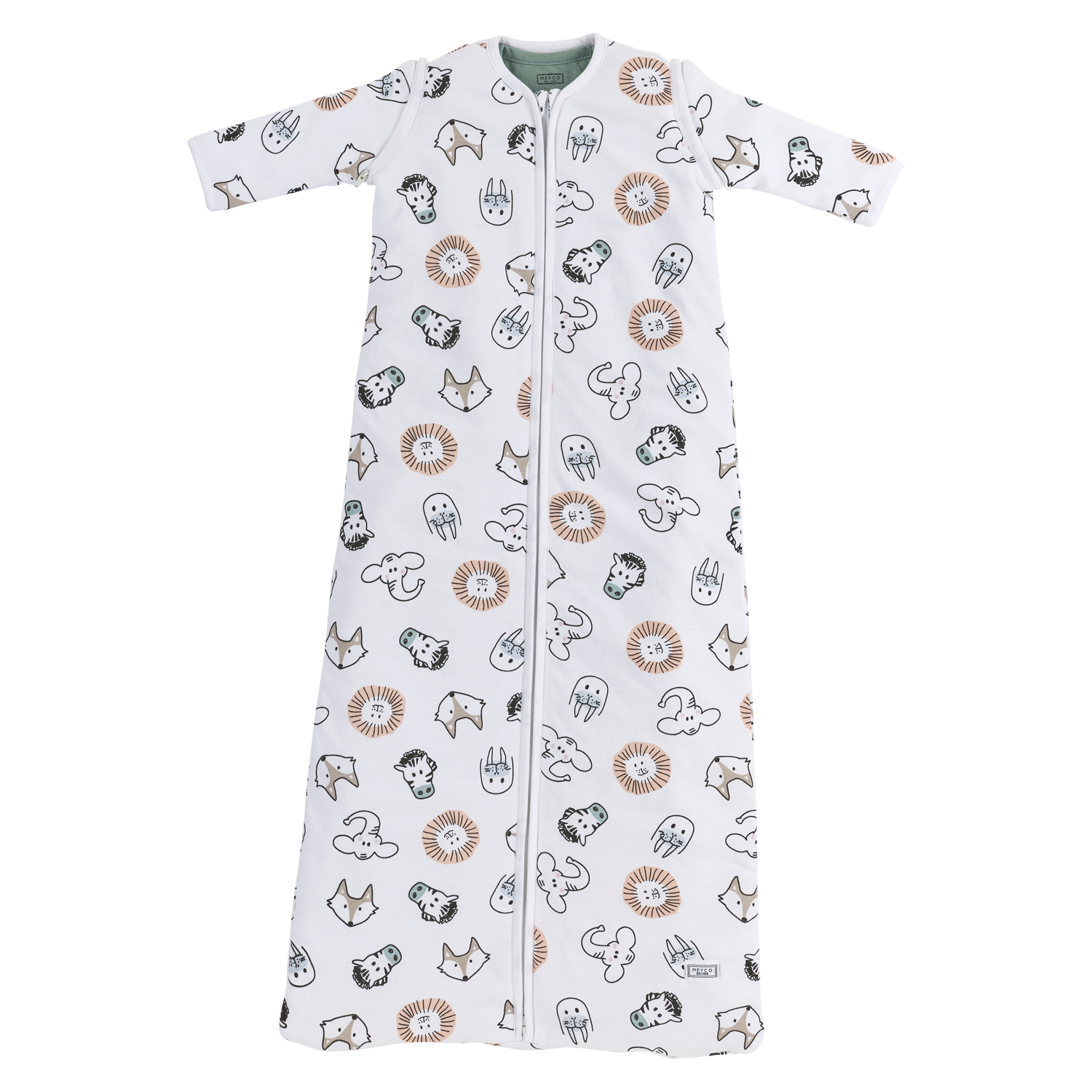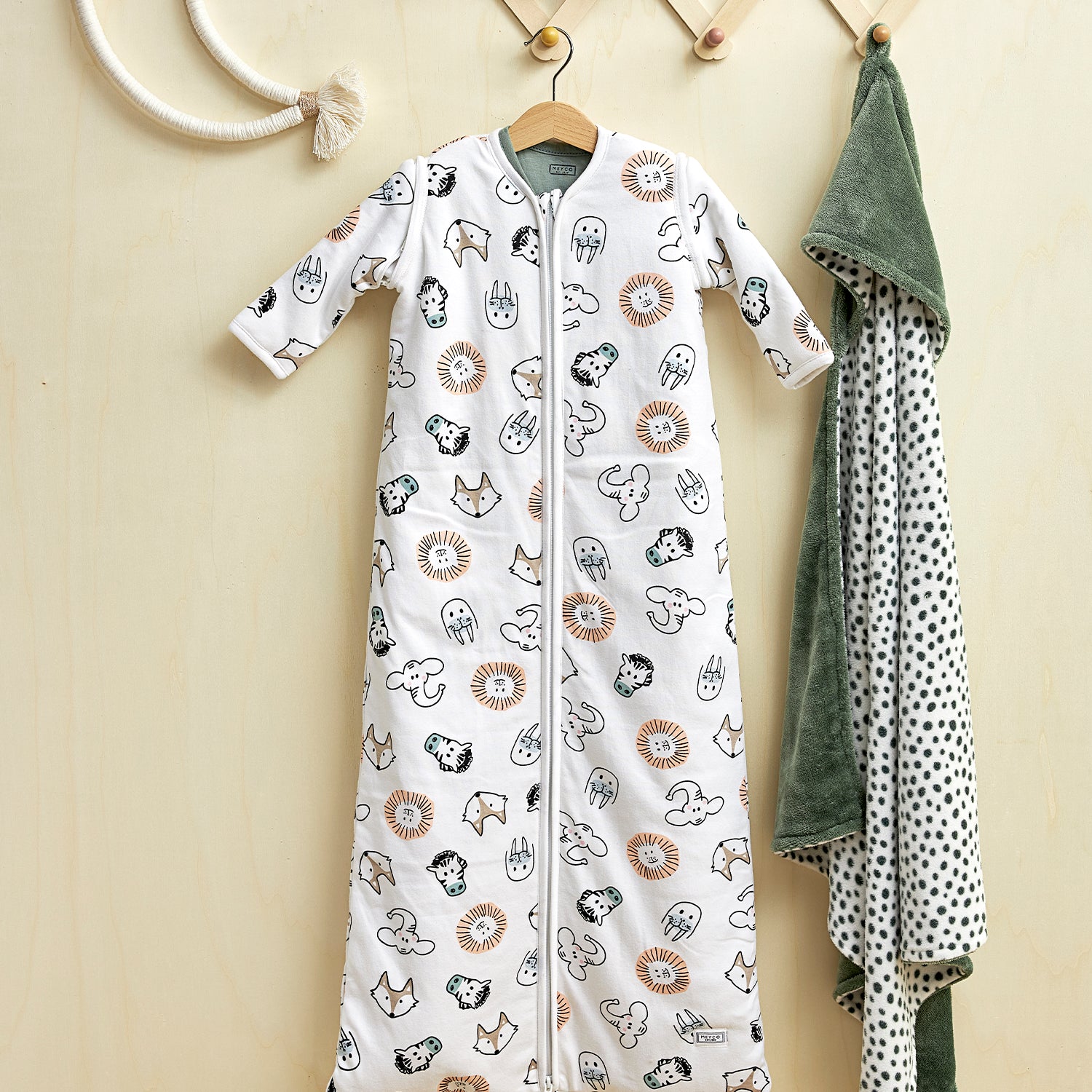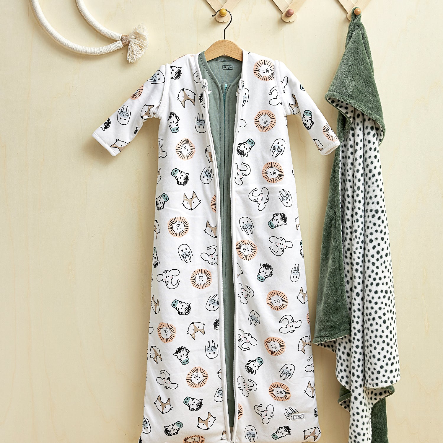 Sowohl der Innen- als auch Außenschlafsack besteht aus 100 % Baumwolle, wodurch das Material atmungsaktiv ist und sich angenehm weich anfühlt. Das Futter des Außenschlafsacks besteht aus Polyester. Dadurch entsteht optimaler Komfort. Der Schlafsack ist größenverstellbar, indem der Fußsack umgefaltet und mit den Druckknöpfen befestigt wird. Das ist praktisch, denn der Schlafsack ist ab sechs Monaten geeignet und dein Kind passt so noch bis zu einem Alter von drei Jahren hinein.