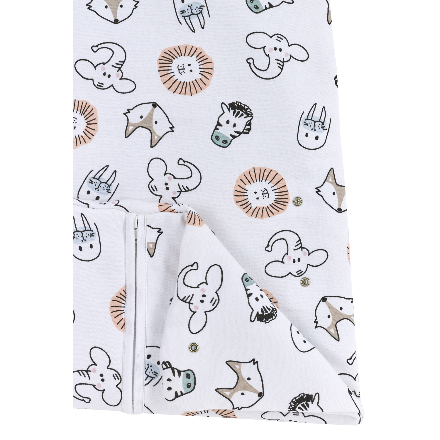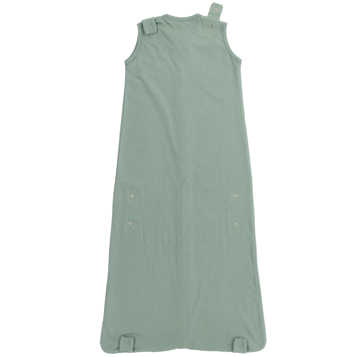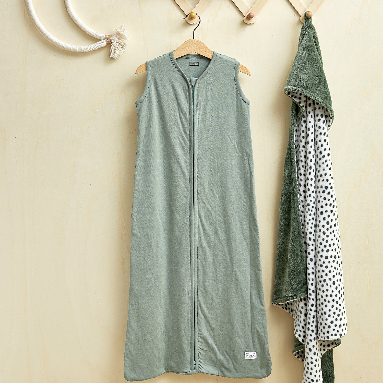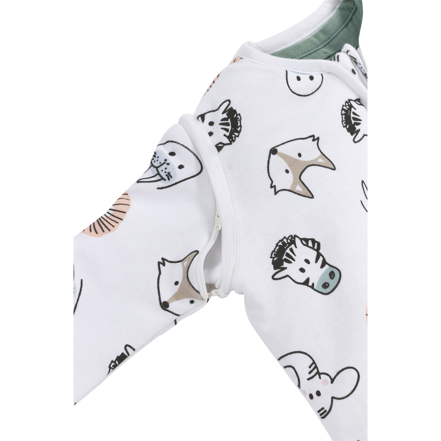 Sowohl der Innen- als auch Außenschlafsack besteht aus 100 % Baumwolle, wodurch das Material atmungsaktiv ist und sich angenehm weich anfühlt. Das Futter des Außenschlafsacks besteht aus Polyester. Dadurch entsteht optimaler Komfort. Der Schlafsack ist größenverstellbar, indem der Fußsack umgefaltet und mit den Druckknöpfen befestigt wird. Das ist praktisch, denn der Schlafsack ist ab sechs Monaten geeignet und dein Kind passt so noch bis zu einem Alter von drei Jahren hinein.