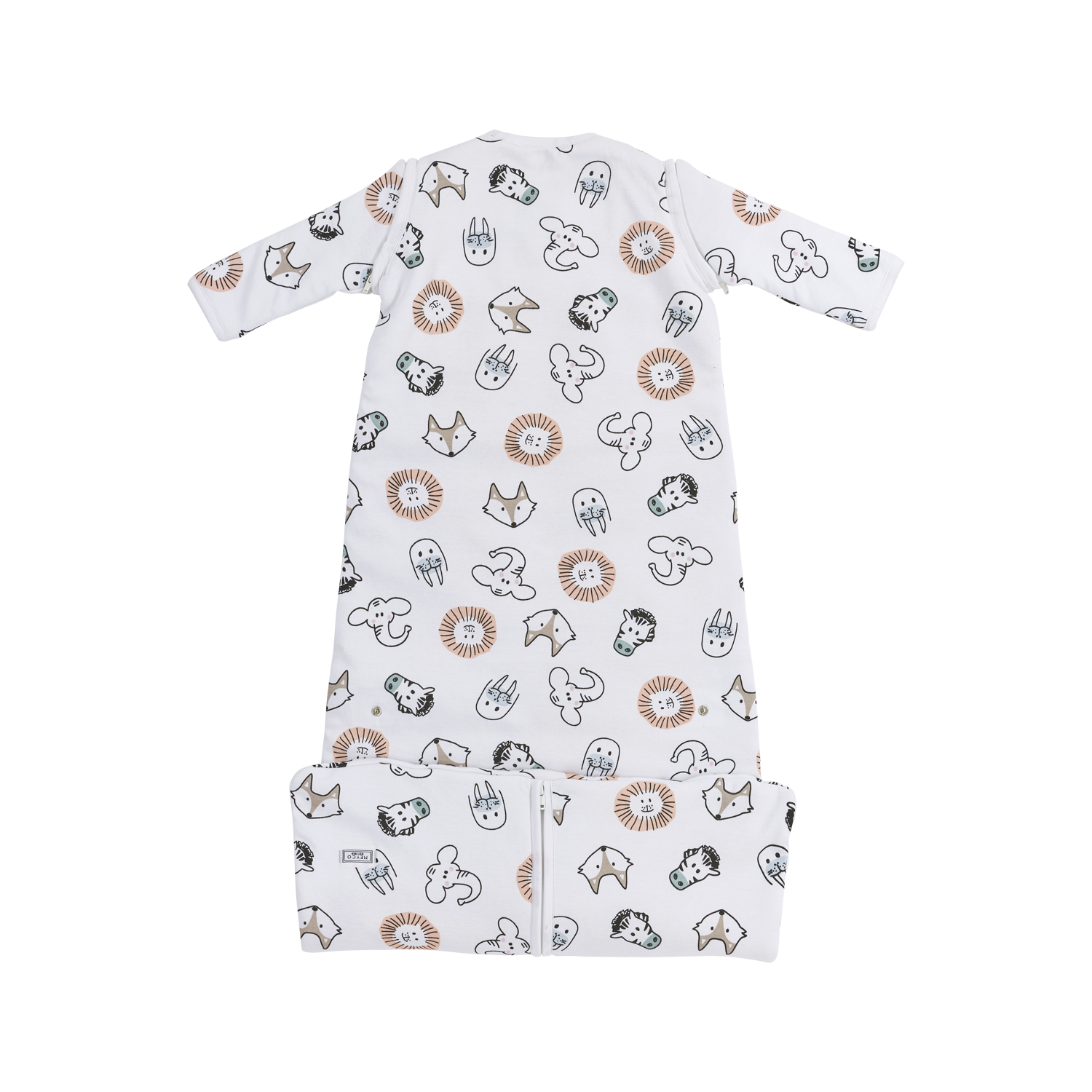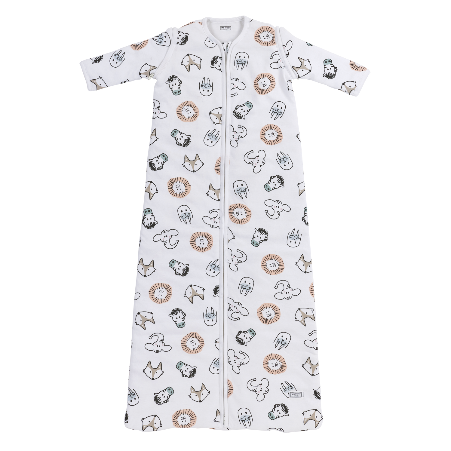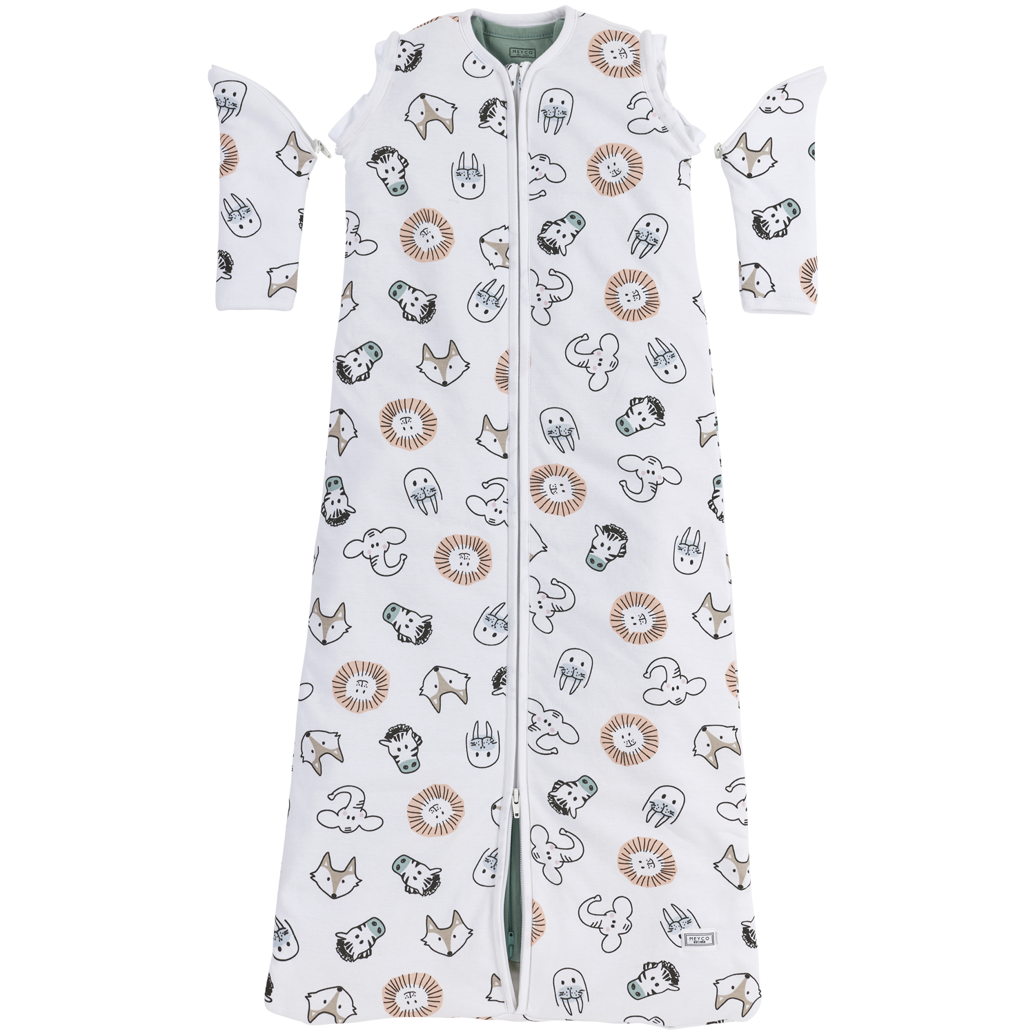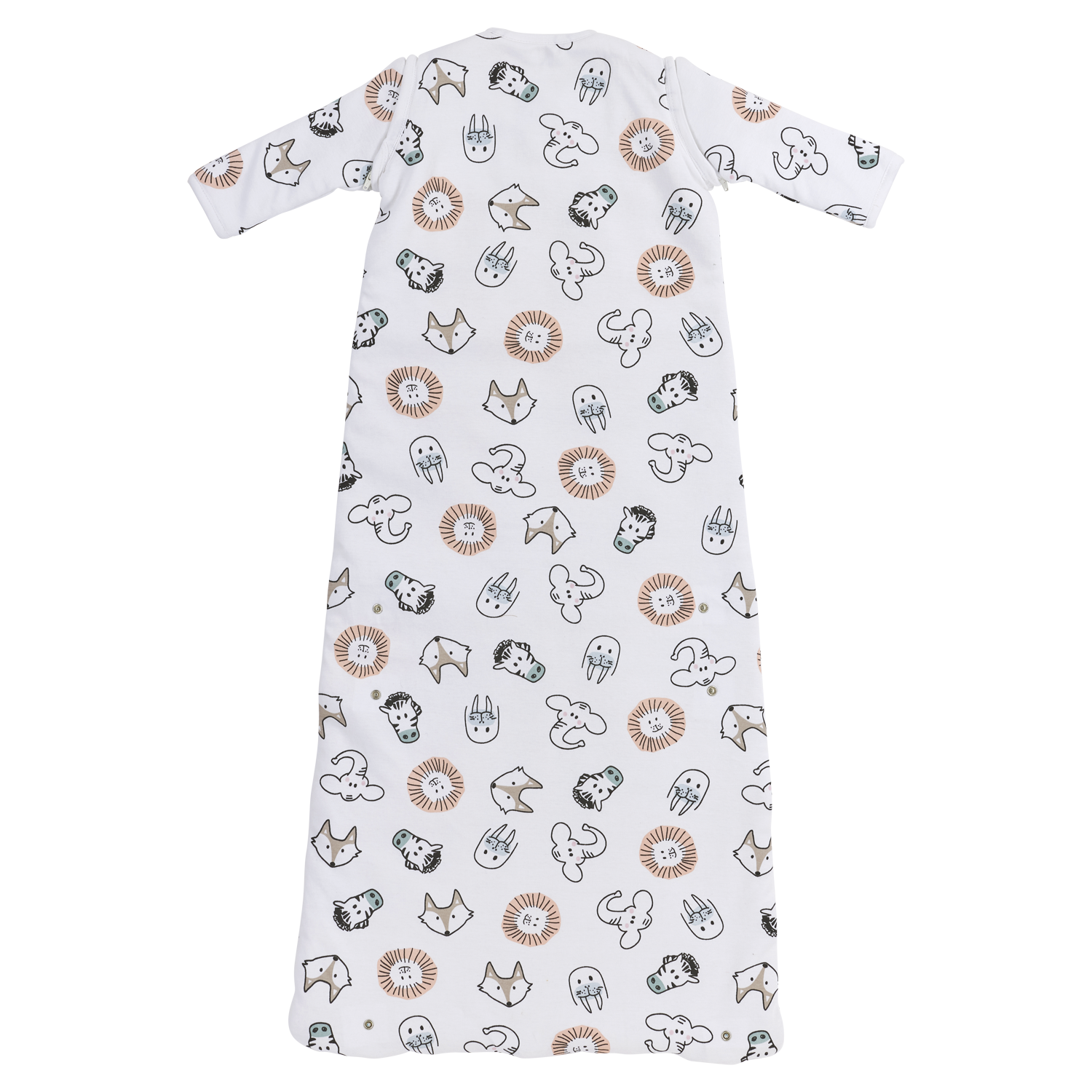 Der Schlafsack besteht aus einem gefütterten Außenschlafsack mit abnehmbaren ärmeln und einem Innenschlafsack, der ganz einfach mit Druckknöpfen befestigt werden kann. Der Innenschlafsack kann an warmen Tagen und Nächten einzeln verwendet werden, während der gefütterte Außenschlafsack perfekt für Frühling und Herbst ist. Zusammen sind sie dann die beste Lösung für kalte Wintertage und -nächte!