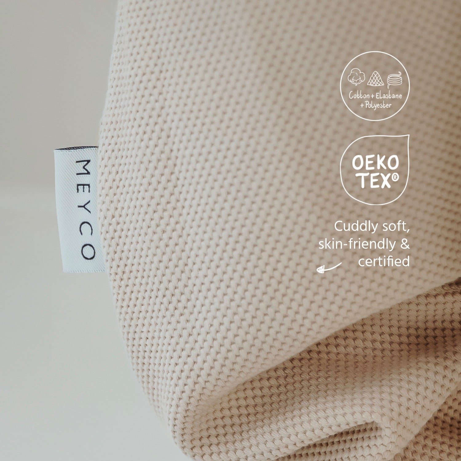 - Double-layer fabric: inside 100% cotton jersey, outside 58% cotton, 38% polyester, 3% elastane