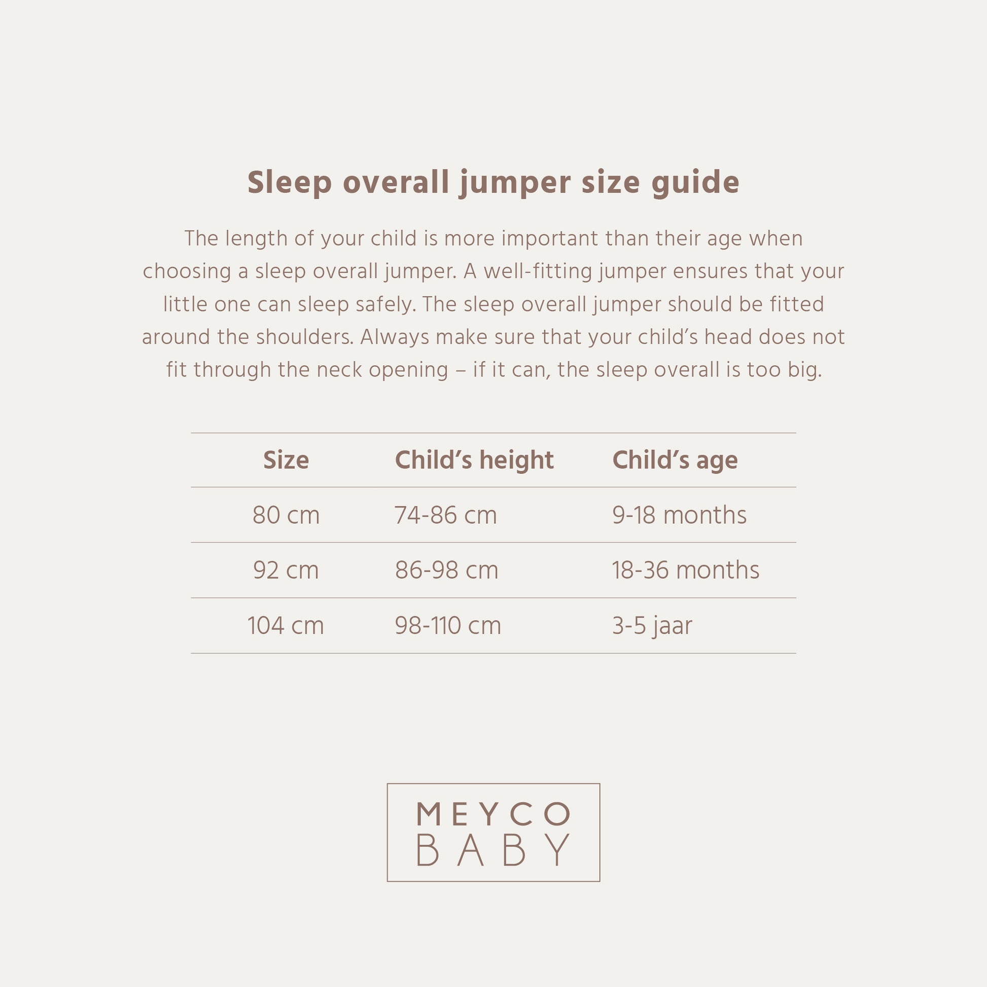 Your child’s height is more important than age when choosing the right size. A jumper that is too large may cause your baby to slip down into it; one that is too small restricts movement.