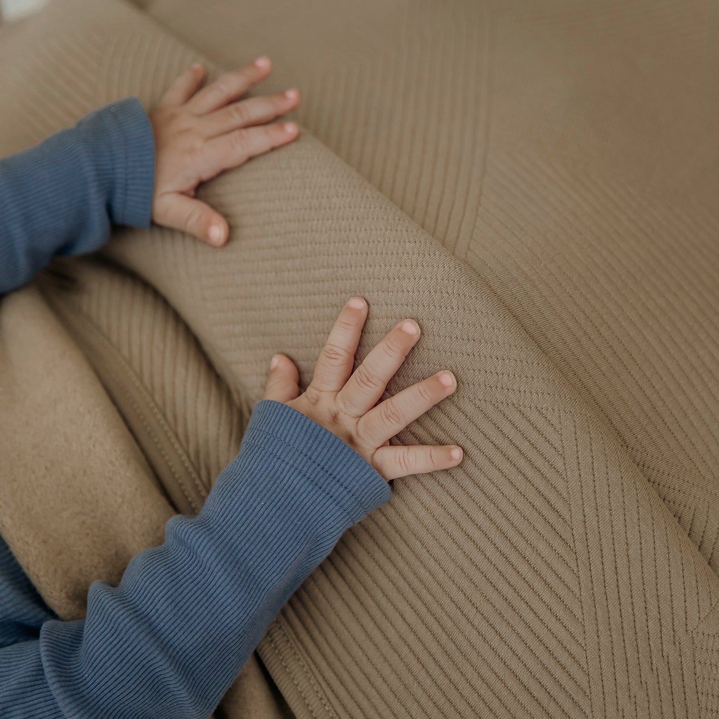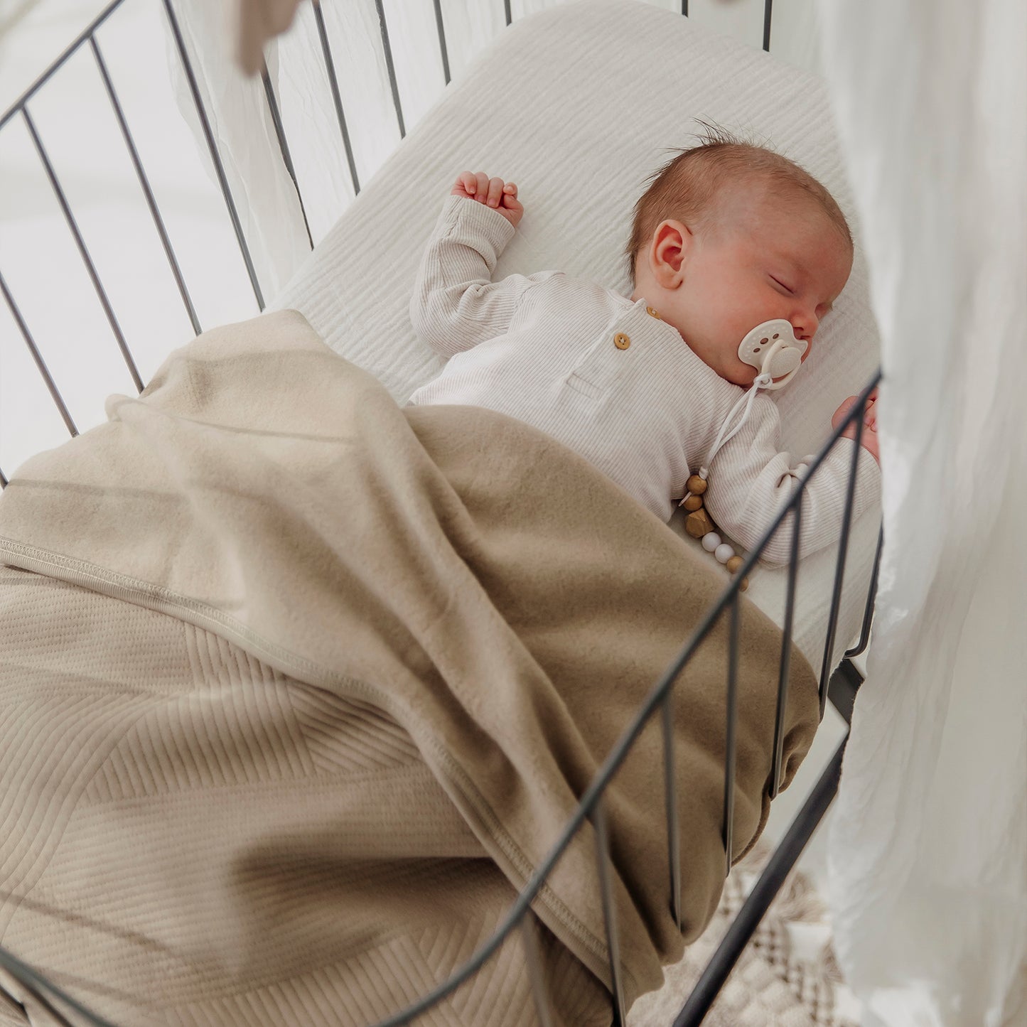 Whether you place your little one in the crib, the baby bed, or cuddled up on your lap, this blanket provides ultimate comfort and a luxurious look. The herringbone pattern and soft colors of indigo, taupe, or rose make it a real eye-catcher in the nursery.