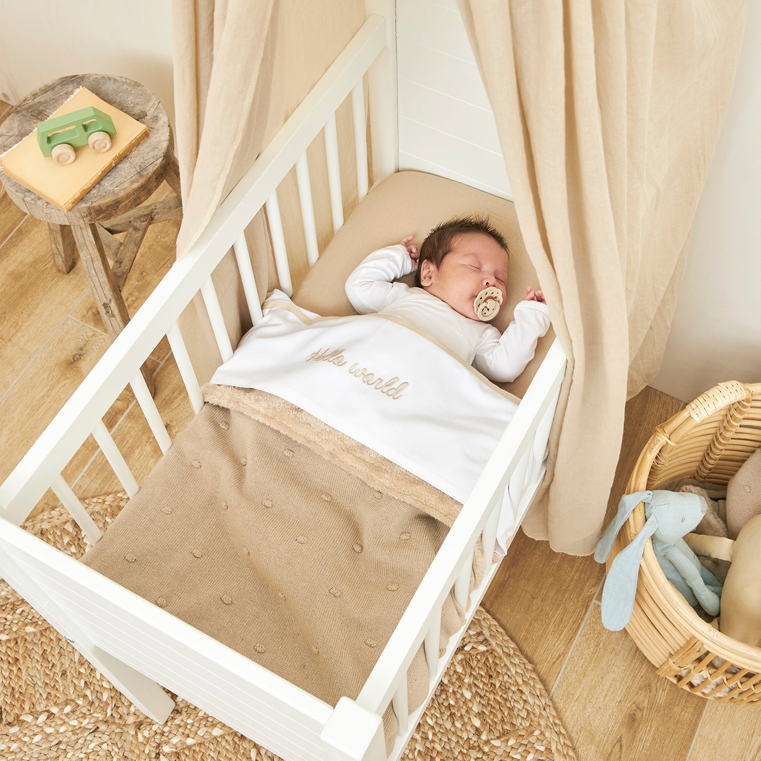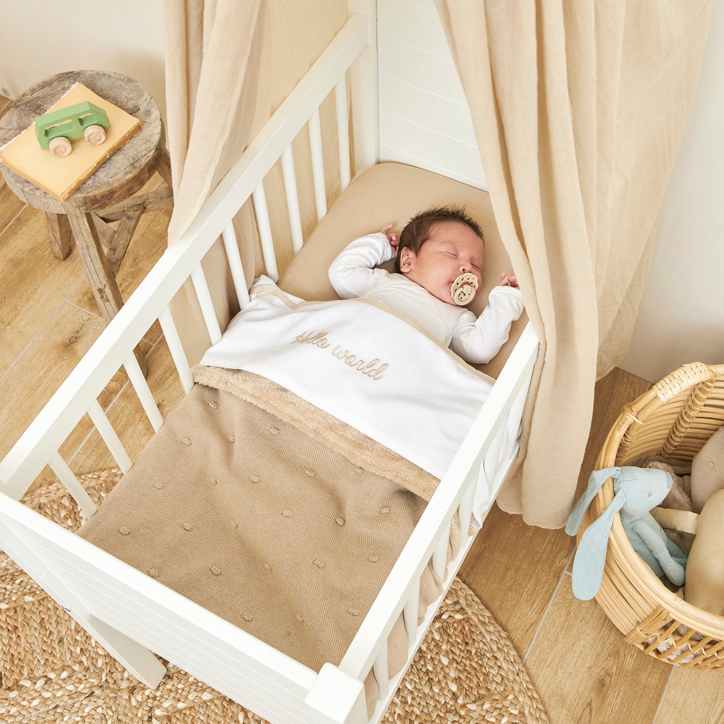 The blanket is available in two sizes: a crib blanket of 75x100 cm and a cot blanket of 100x150 cm. You use the crib blanket in the crib and/or in the pram and the crib blanket is perfect for in the crib. Has your little one outgrown the crib? This blanket is also wonderful as a plaid on the couch or on the bed!