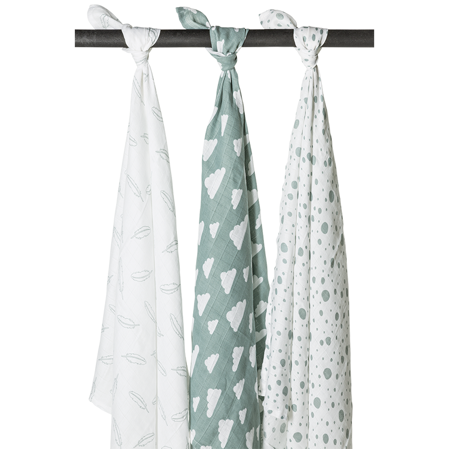 Our muslin care products are made of 100% muslin cotton. This lovely material absorbs moisture super well, dries quickly and feels extra soft for that delicate baby skin. You can use the swaddles (120x120 cm) as a towel after a bath, as a cosy blanket or even as a breastfeeding cover. The muslin cloths (70x70 cm) are perfect as a base during changing or in the crib, pram or playpen. The mouth wipes (30x30 cm) are handy for feeding and the washcloths (20x17 cm) for washing or cleaning dirty faces!