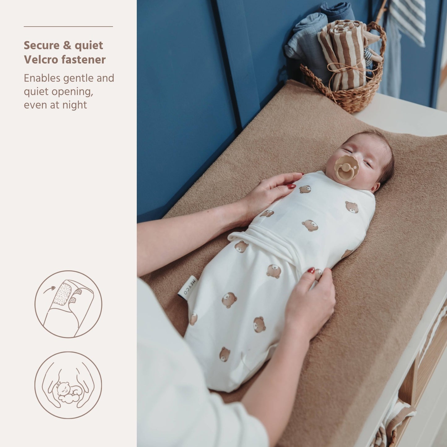 The SwaddleMeyco creates the secure feeling of the womb, making your little one calm and relaxed. This way he or she also learns better to fall asleep on your own. In addition, small babies are not aware yet that they have arms, which often causes them to wake themselves up unnecessarily. That is also a thing of the past when you choose swaddling.