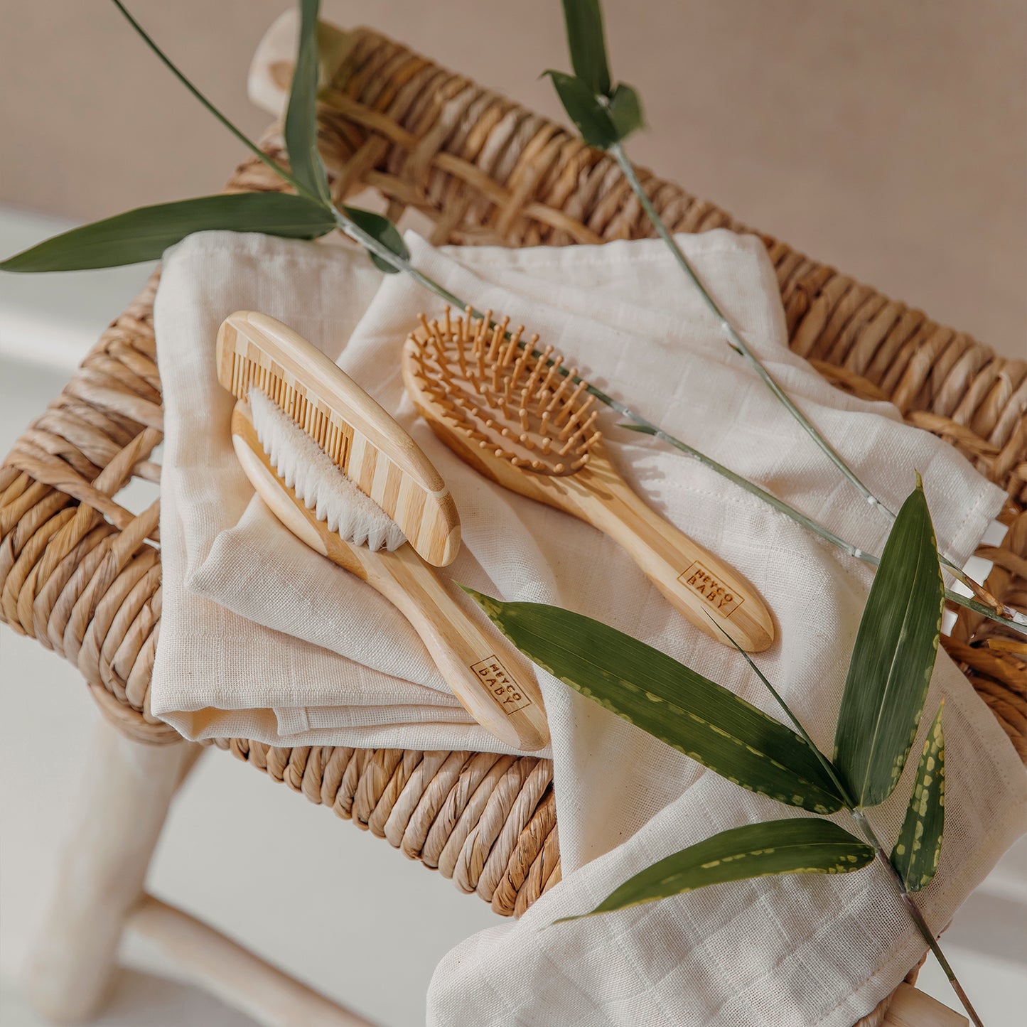 A well-groomed head of hair starts from the very beginning! With this stylish 3-piece grooming set from Meyco Baby, brushing becomes a soft and soothing moment for you and your little one. The set includes a wooden comb, a brush with soft goat hair for your baby’s sensitive scalp, and a brush with wooden pins for thicker hair.