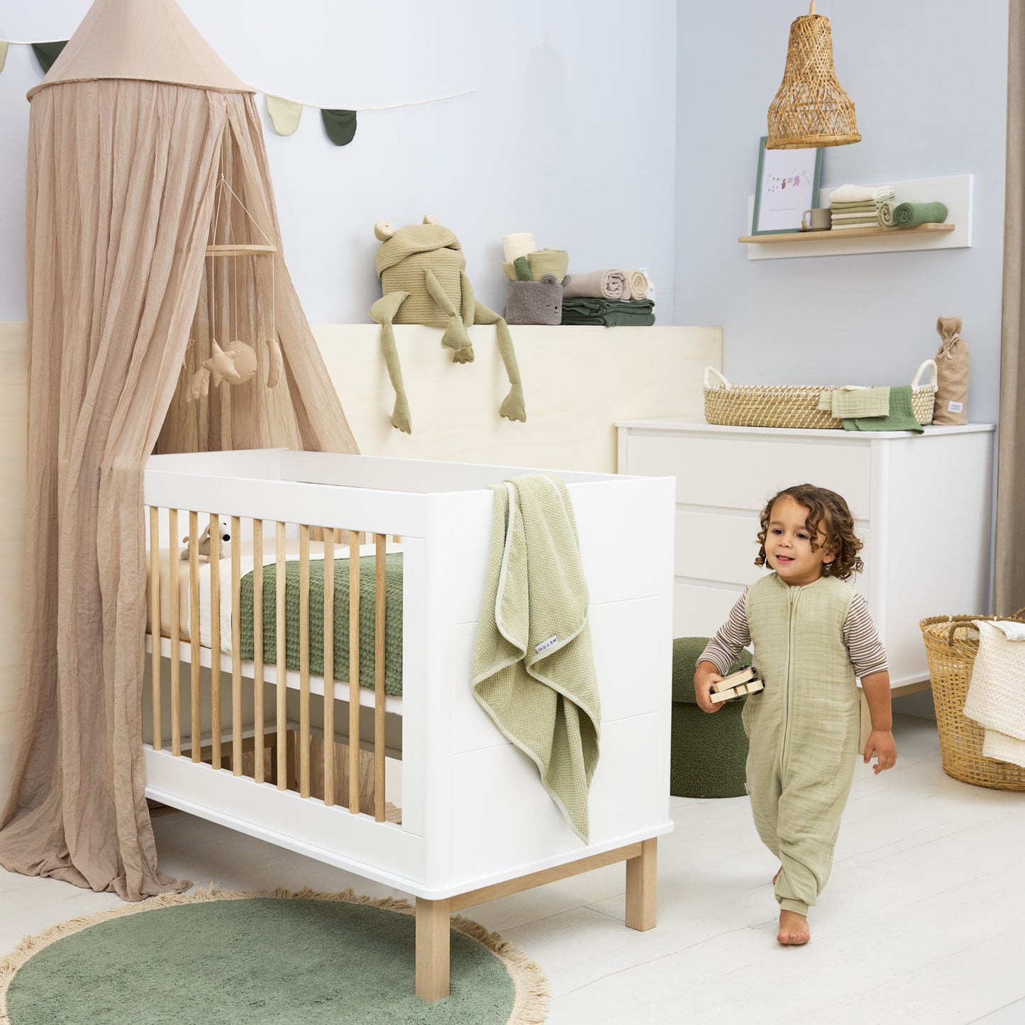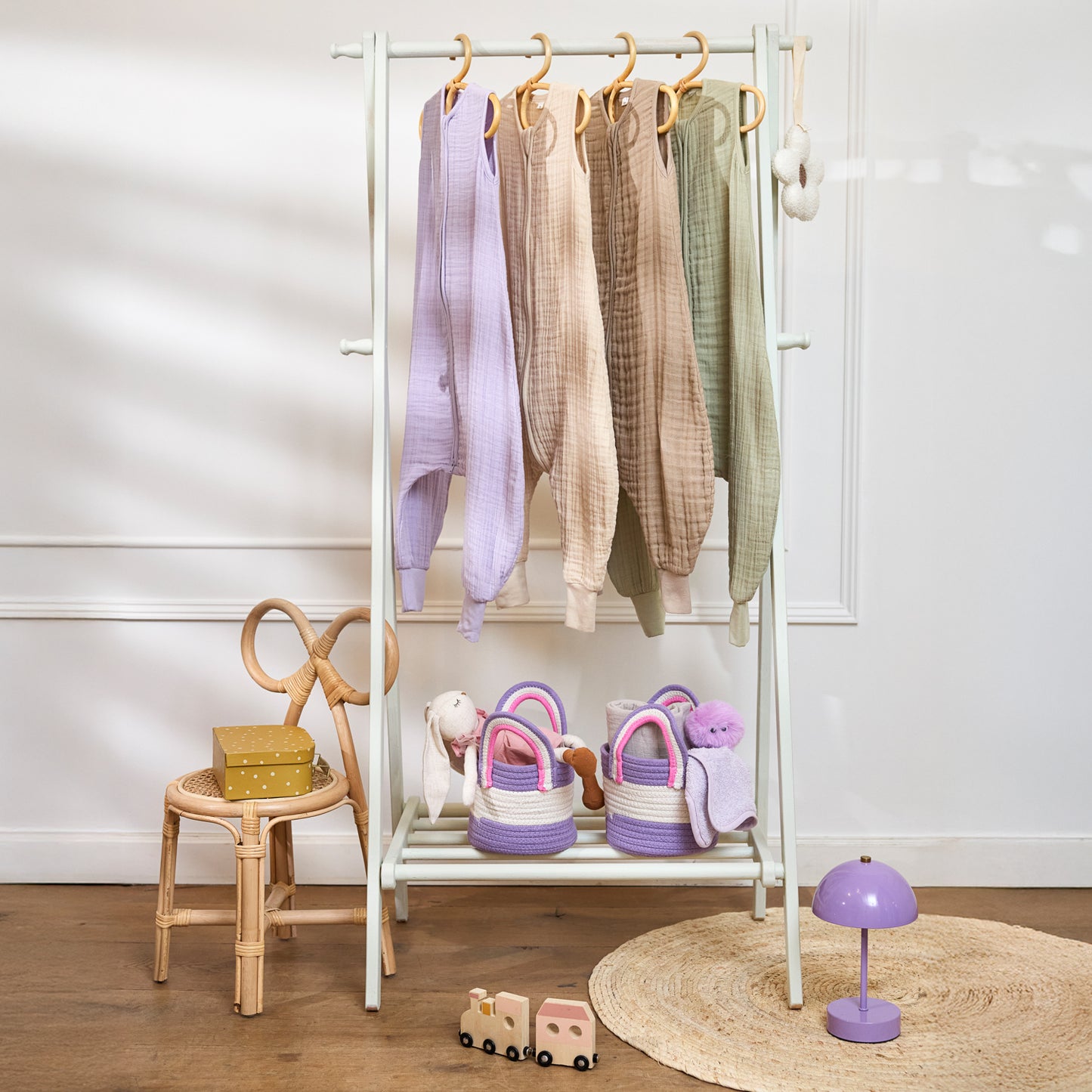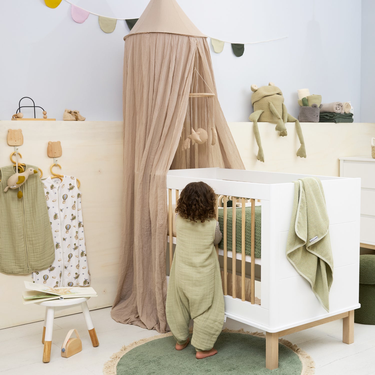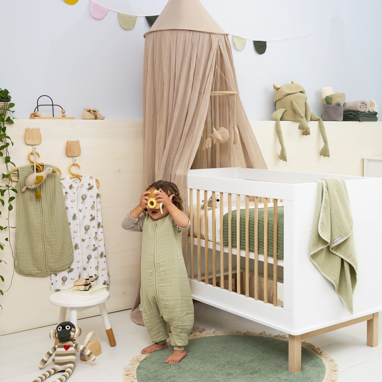 The jumper is made of 100% pre-washed muslin cotton and has a TOG rating of 0.5, making it ideal for warmer summer days and nights. The breathable cotton ensures excellent ventilation, perfect moisture regulation, and dries very quickly. This keeps your little one’s sleeping environment at a comfortable temperature without overheating. Thanks to the snug, safe fit around the neck and arm openings, your child can sleep safely and comfortably.
