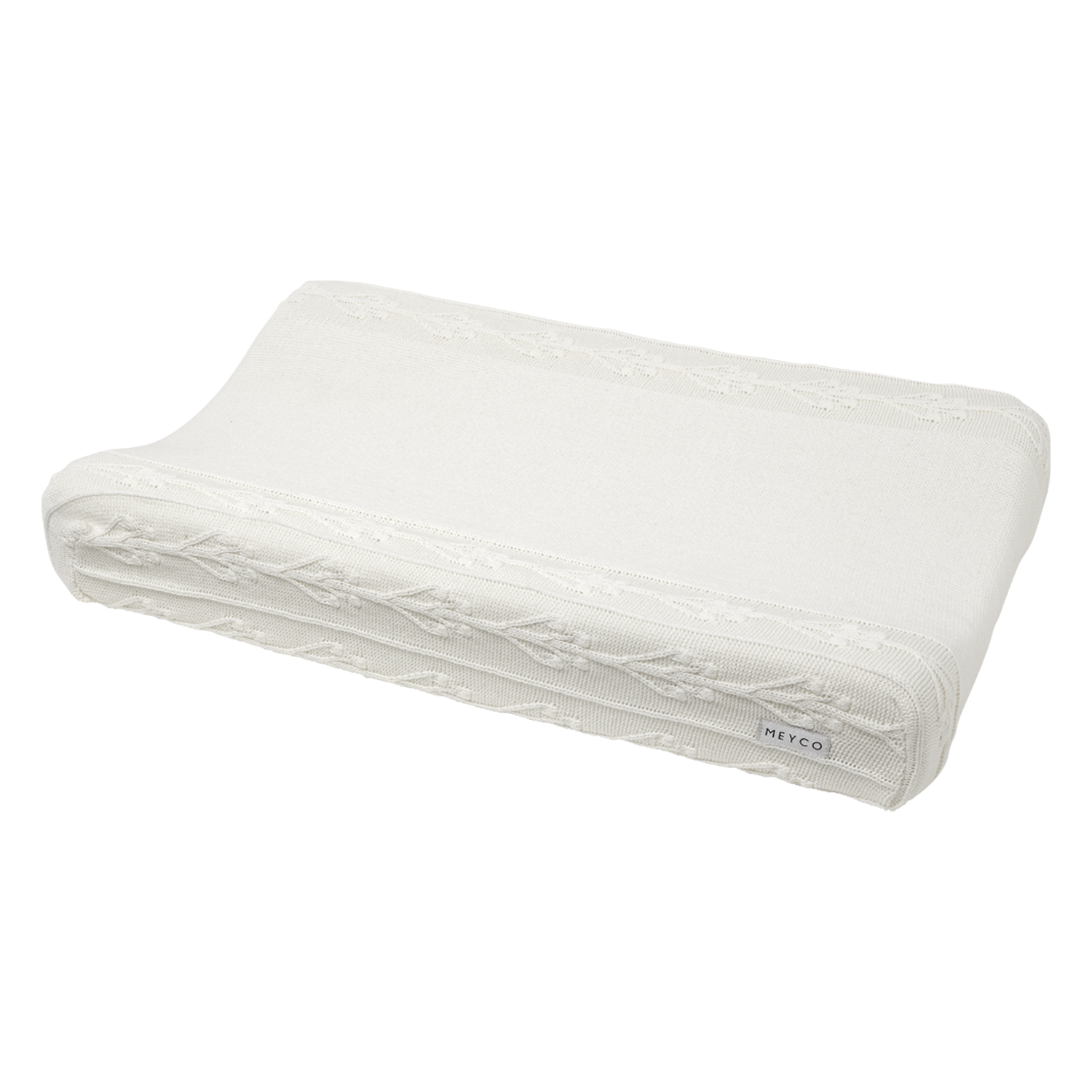 Een aanwinst in iedere babykamer: deze Meyco Baby Aankleedkussenhoes Romantic Flower. De hoes is gebreid en heeft aan de zijkanten een prachtige afwerking met een patroon van gebreide, klassieke bloemen. Dit geeft een luxe en warme uitstraling aan iedere babykamer. De hoes doe je om het verschoningskussen. Zo ligt je kleintje er heerlijk comfortabel bij tijdens het afdrogen, aankleden en verschonen.