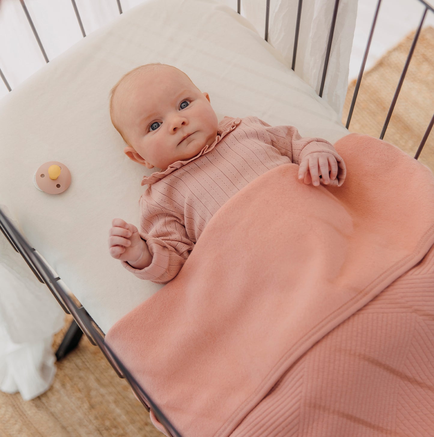 Of je je kleintje nu in de wieg, het ledikant of lekker bij jou op schoot legt, deze deken zorgt voor ultiem comfort ?n een luxe uitstraling. Het visgraatpatroon en de zachte kleuren indigo, taupe of rose maken het een echte eyecatcher in de babykamer.