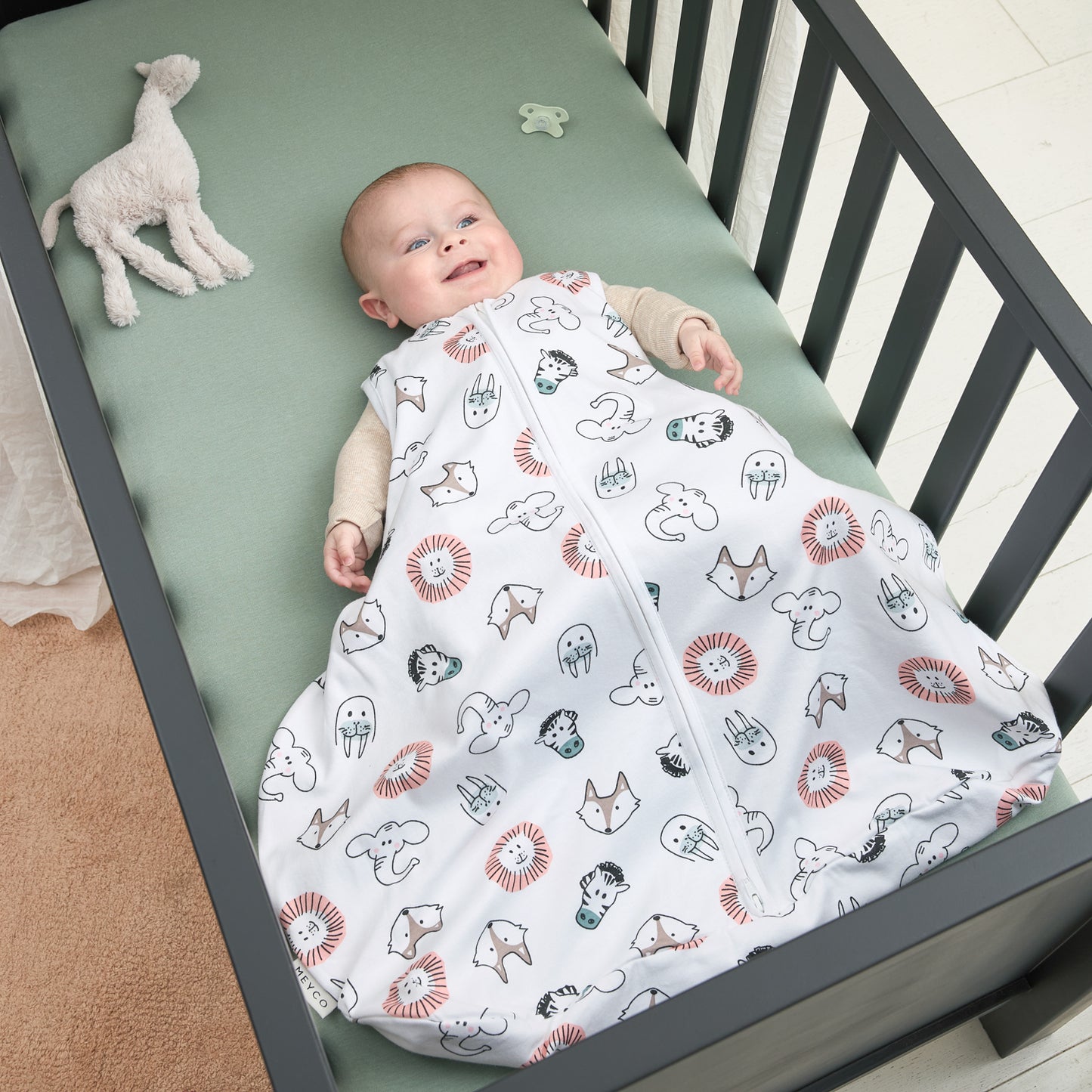 De interlock-slaapzakken zijn gemaakt van een dubbele laag zachte katoenen jersey. Deze is samengesteld uit fijne garens die prettig aanvoelen op het gevoelige huidje van je baby. Met een TOG-waarde van 0.5 is de slaapzak licht en luchtig, terwijl de soepele stof zorgt voor ademend comfort. Daarnaast heeft de slaapzak een fijne, veilige pasvorm die goed aansluit bij de hals en armpjes, zodat je kindje vrij kan bewegen en toch veilig slaapt.