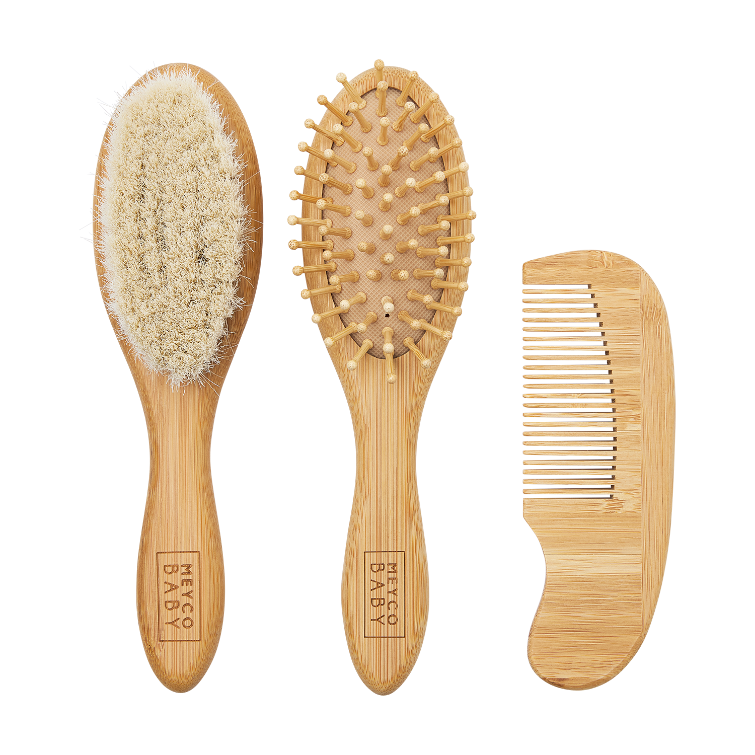 Een verzorgde haardos begint al bij de allerkleinsten! Met deze stijlvolle 3-delige kapset van Meyco Baby maak je van het borstelen een fijn en zacht moment voor jou en je kindje. De set bestaat uit een houten kam, een borstel met zachte geitenharen voor de gevoelige babyhoofdhuid én een borstel met houten pinnen voor het wat dikkere haar.