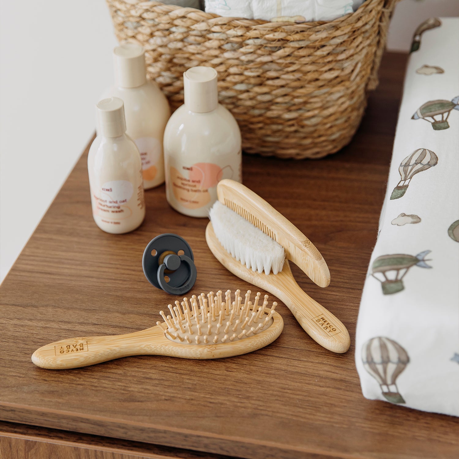 De borstels zijn speciaal ontworpen voor het kwetsbare babyhaar en de gevoelige hoofdhuid. De borstel met geitenhaar voelt extra zacht aan en is ideaal voor dagelijks gebruik, terwijl de pinnenborstel het haar voorzichtig losmaakt. De houten kam ligt fijn in de hand en is handig om kleine klitjes los te maken. Dankzij het duurzame materiaal zijn de borstels ook nog eens milieuvriendelijk.