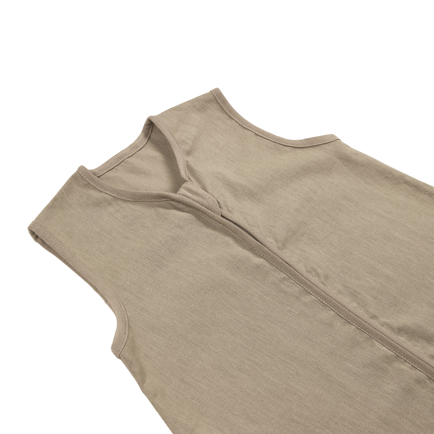 De slaapzak met benen is ongevoerd en gemaakt van een fijne 1-laagse stof van 52% linnen en 48% katoen. Linnen staat bekend als het meest verkoelende materiaal en is ideaal voor warme zomernachten, terwijl het katoen ervoor zorgt dat de slaapzak zacht en comfortabel aanvoelt op de huid. Het ademende materiaal zorgt voor uitstekende ventilatie en een prettig, luchtig slaap- en speelklimaat, zodat je kindje comfortabel blijft zonder oververhit te raken. Dankzij de veilige pasvorm die mooi aansluit bij hals en armpjes kan je kindje vrij bewegen en toch veilig spelen en slapen.