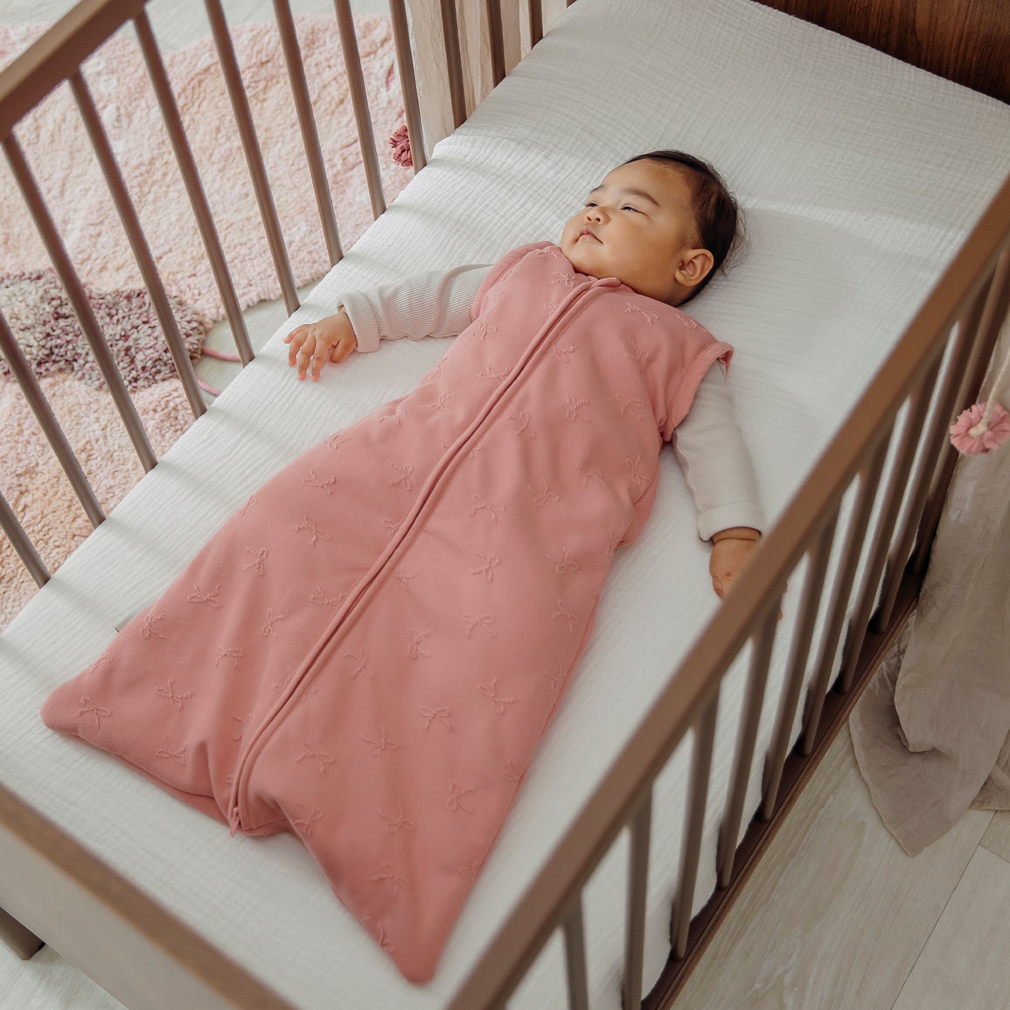 Deze gevoerde slaapzak is voorzien van afritsbare mouwen en een TOG-waarde van 2.5, ideaal voor gebruik in verschillende seizoenen. De unieke 3D applicatie in bow-dessin zorgt voor een verfijnde look, terwijl de zachte stof zorgt voor optimaal comfort. De veilige pasvorm sluit goed aan bij de hals en armpjes en voorkomt dat je kindje in de slaapzak wegzakt. Dankzij de lange, doorlopende rits aan de voorkant is verschonen en aan- of uitkleden extra makkelijk, zonder je baby te veel te storen in zijn of haar slaap.