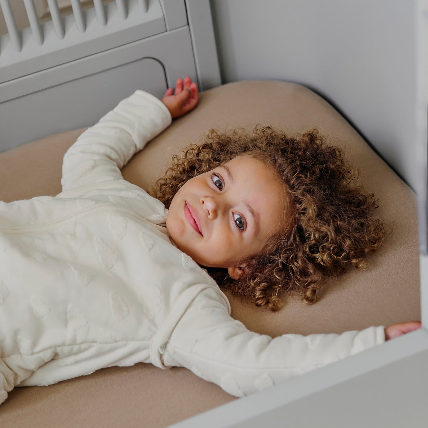 De gevoerde slaapzak heeft een buitenzijde van 78% katoen en 22% polyester, en een zachte binnenzijde van 100% katoen voor optimaal comfort en extra warmte. De stof voelt heerlijk zacht aan, ademt uitstekend en biedt een goede vochtregulatie. De slaapzak is afgewerkt met een verfijnd 3D-effect van wolkjes, wat zorgt voor een subtiele maar chique uitstraling.