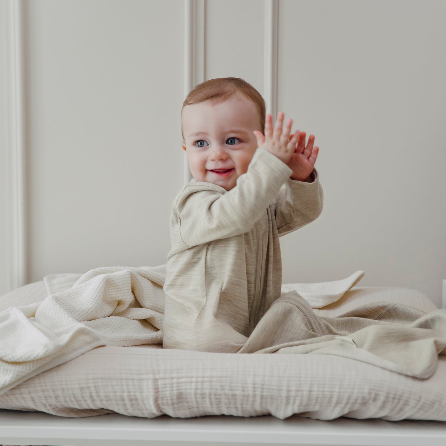 Merinowol is een echt natuurwonder. Dankzij de vezels ademt het goed, voert het vocht af en houdt het je kindje warm als het koud is en juist koel als het wat warmer is. Ideaal voor het hele jaar door.