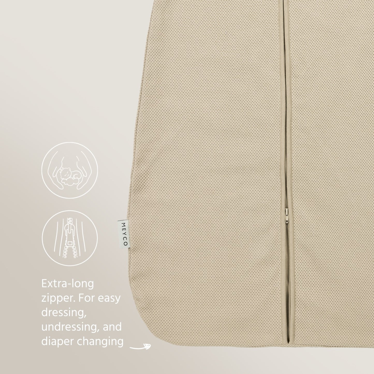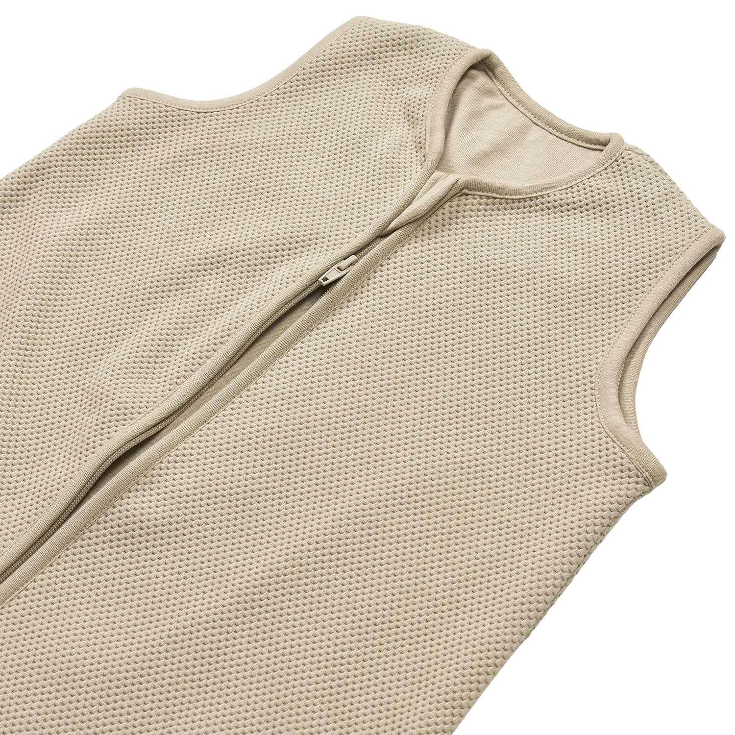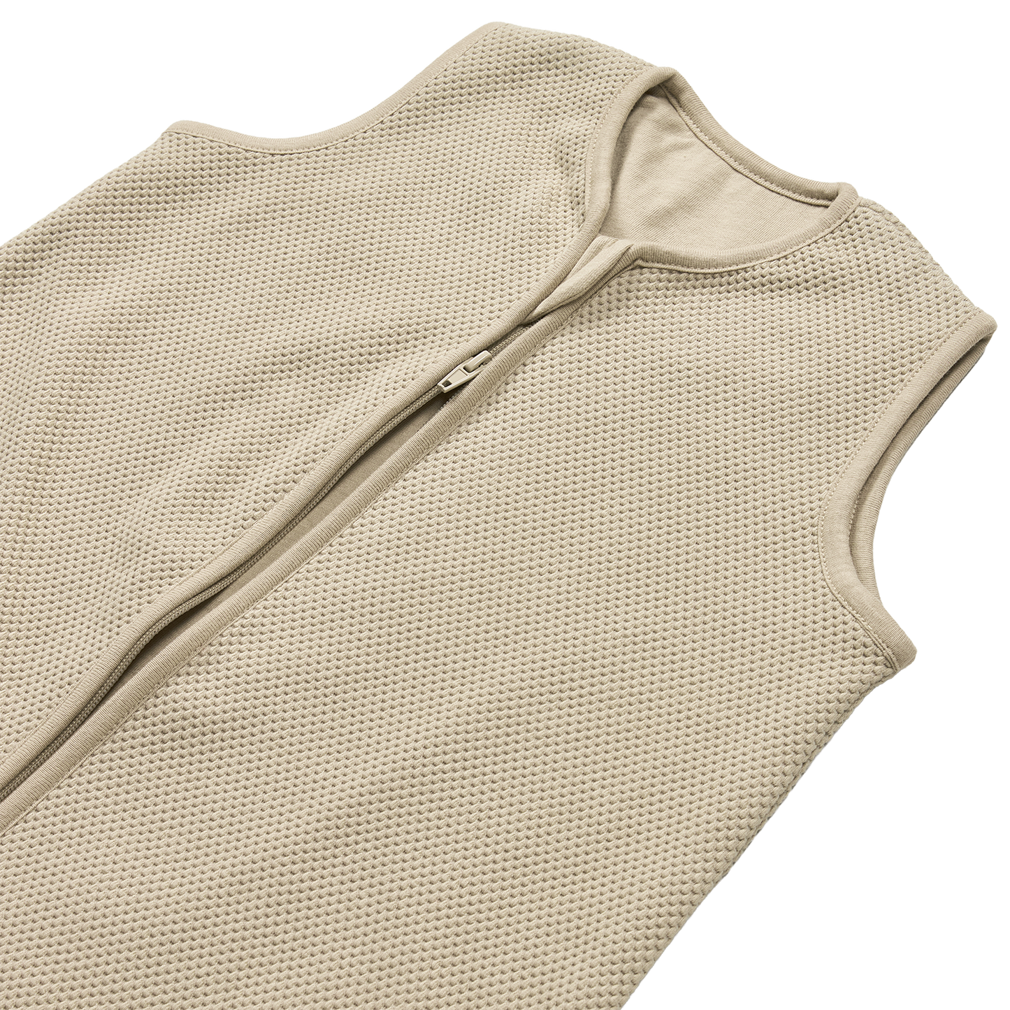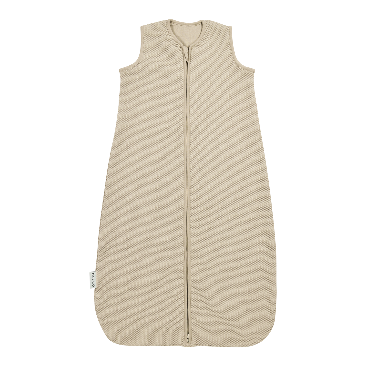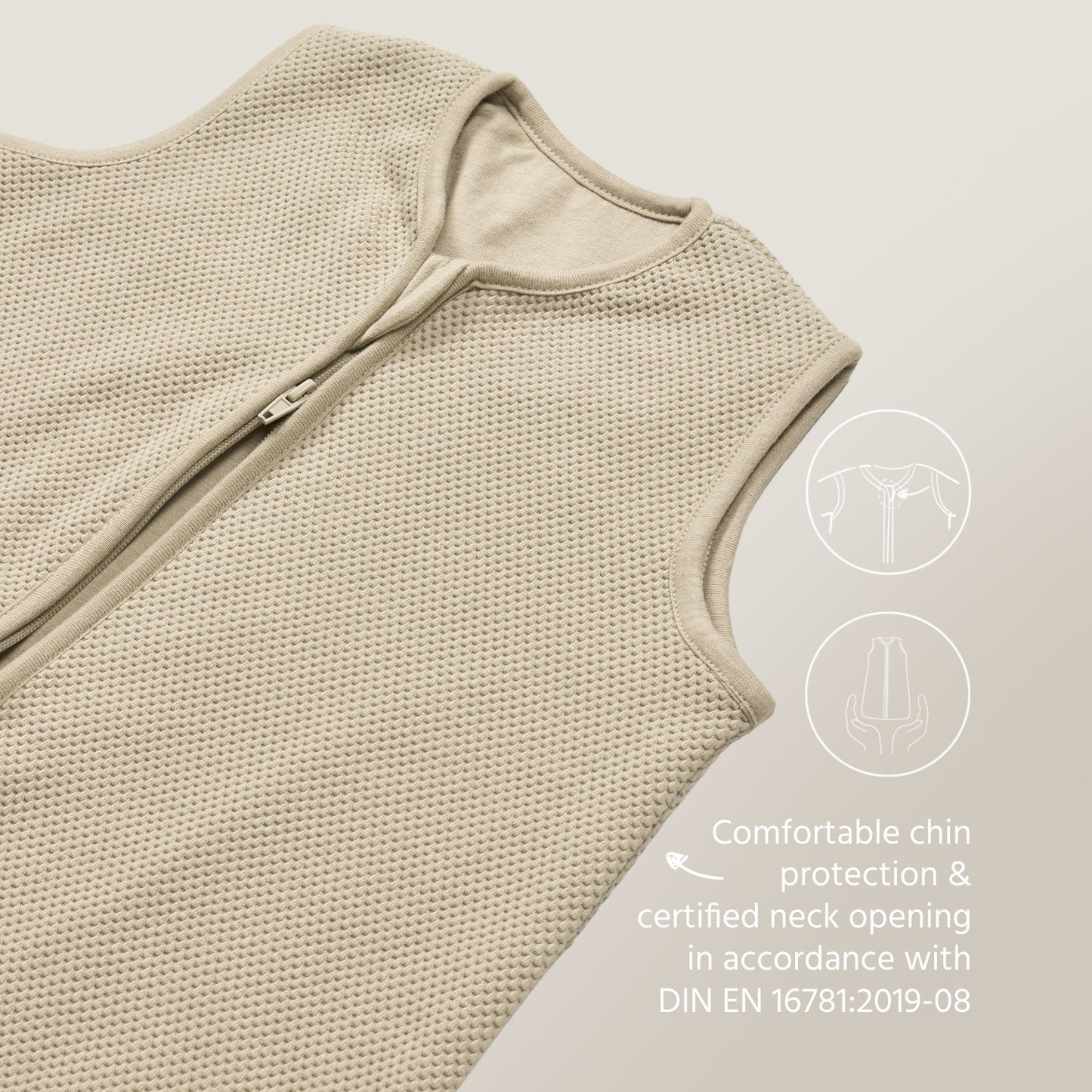 Deze babyslaapzak is ongevoerd en gemaakt van een dubbele laag stof: de binnenzijde is 100% katoen jersey, de buitenzijde bestaat uit 58% katoen, 38% polyester en 3% elastaan. Met een TOG-waarde van 1.0 is de slaapzak ideaal voor de voor- en najaarsnachten. Het ademende materiaal reguleert vocht uitstekend en zorgt voor een prettig slaapklimaat, zodat je kleintje comfortabel kan slapen zonder te warm of te koud te worden. Dankzij de veilige pasvorm die goed aansluit bij de hals en armpjes kan je baby vrij bewegen en toch veilig slapen.