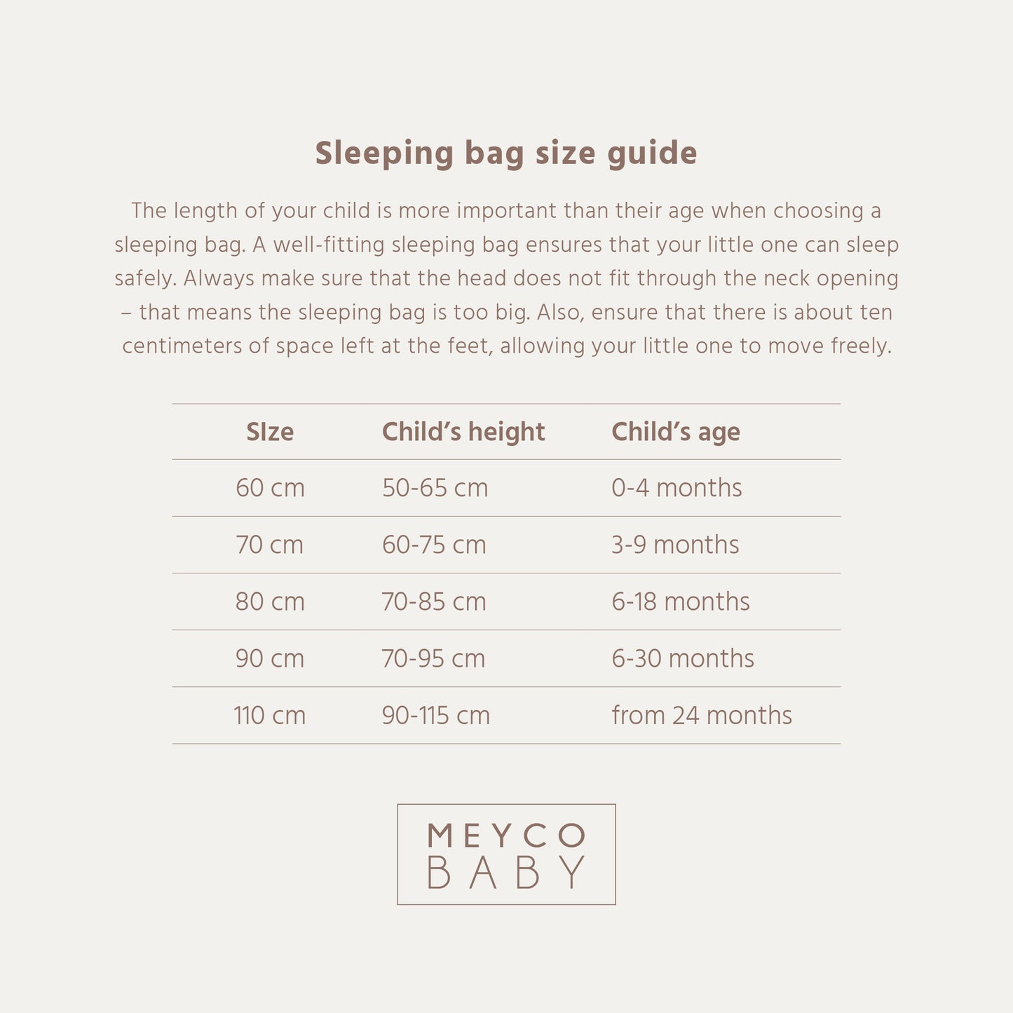 De lengte van je kindje is belangrijker dan de leeftijd bij het kiezen van de juiste maat. Een te grote slaapzak kan ervoor zorgen dat je baby wegzakt; een te kleine slaapzak beperkt de bewegingsvrijheid. De afstand tussen de voetjes en de onderkant van de slaapzak mag niet minder dan 10 cm bedragen.