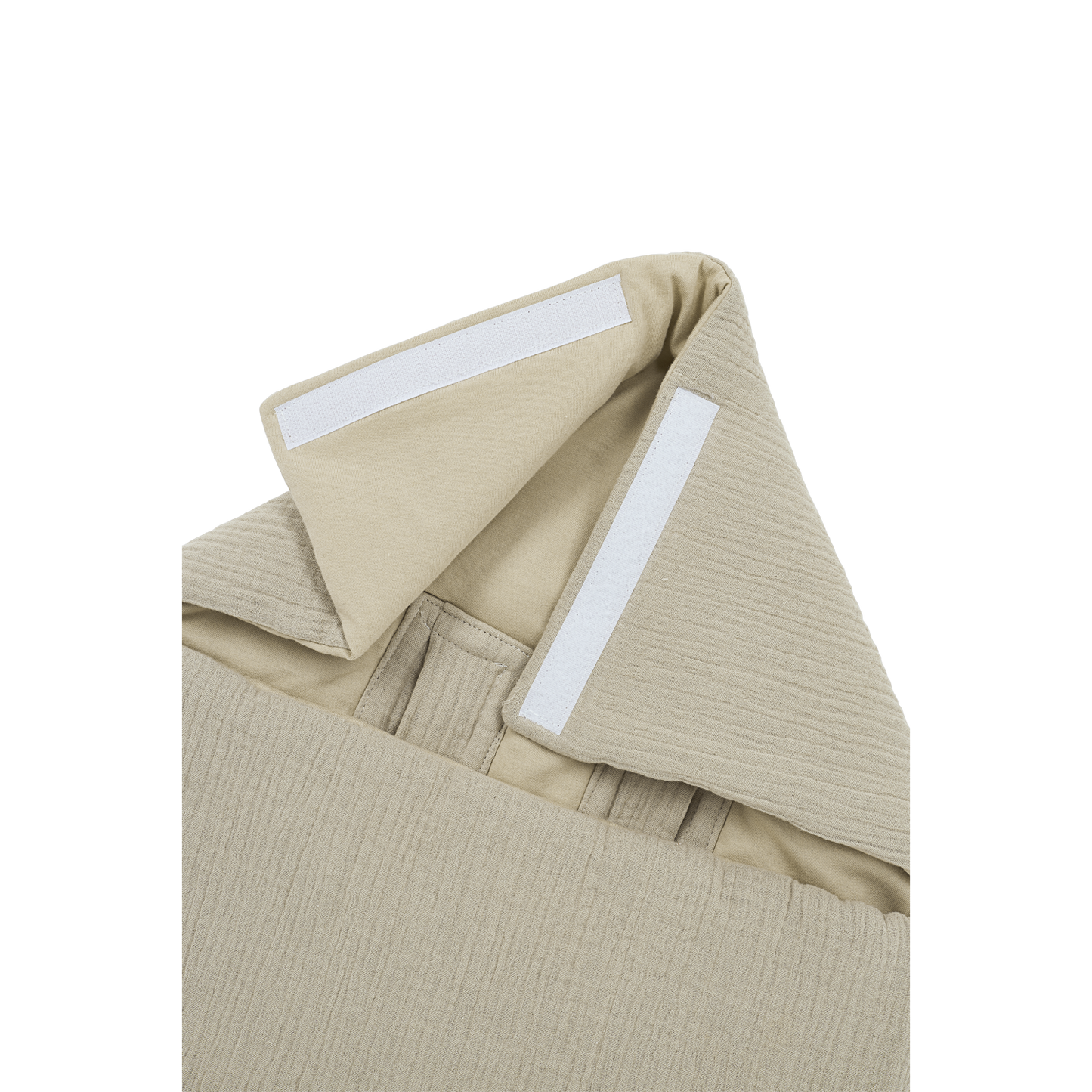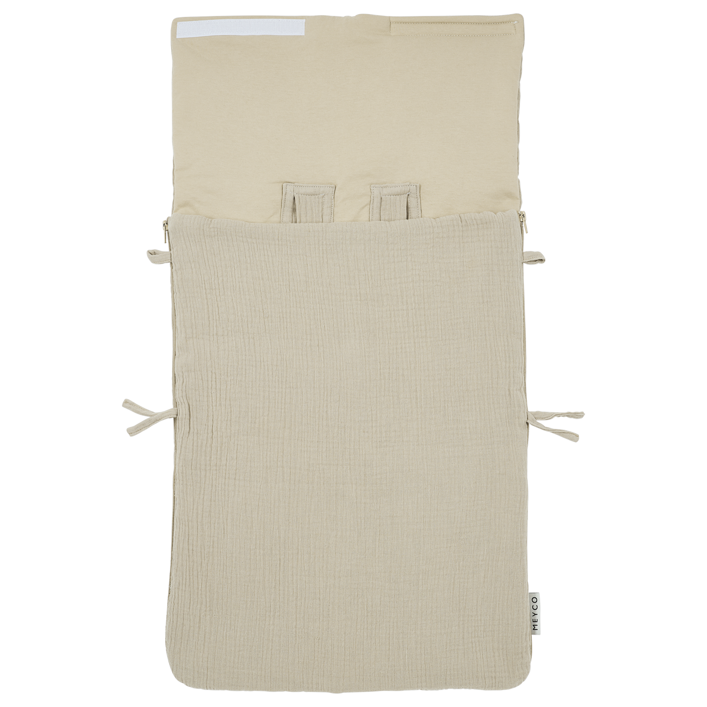 De voetenzak is gemaakt van 100% pre-washed hydrofiele katoen en voelt hierdoor heerlijk zacht aan en ademt goed. De lichte vulling is gemaakt van 100% polyester. De zak kun je eenvoudig open- en dichtmaken met een rits. En als het te warm wordt, rits je hem gewoon open. Handig, toch?